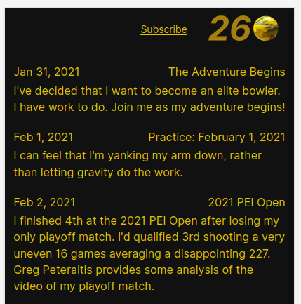 Over at The 260 Bowler I’ve added a handful of diary entries (just blog posts), so now I want a diary page (think recent posts). I started simply, iterating over all the entries, summarizing them, then starting to add nice styles so that they look vaguely like a diary page. I’ll make it look really nice before I move on.